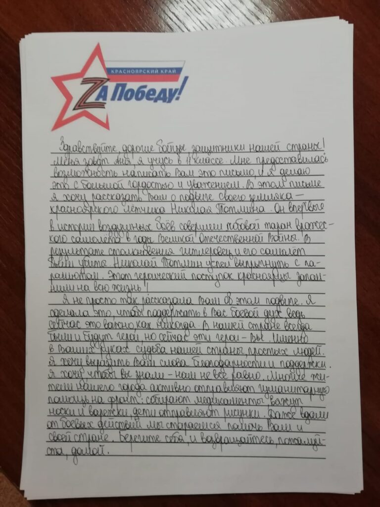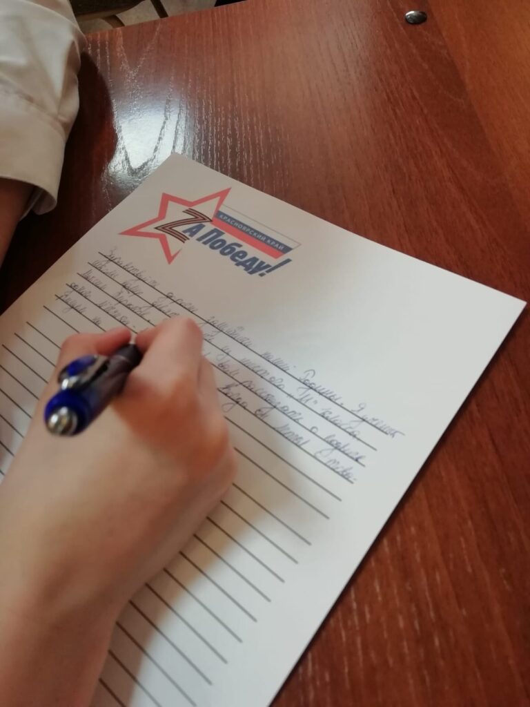 «Я впервые в жизни писала рукописное письмо. Оно сильно отличается от электронного. Здесь я вкладывала душу. Я пожелала бойцам удачи, написала, чтобы они скорее возвращались домой с победой, мы их очень ждем. Мне кажется, что нашим солдатам сейчас нужны такие тёплые слова», — поясняет ученица школы №19 Дарья Дударева.