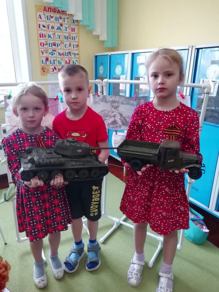 Воспитатели кинули клич среди родителей, предложив таким образом рассказать о 78-й годовщине Победы малышам. Отозвались больше 15 семей. Одни нашли любопытные фото военных лет в сети, другие распечатали портреты своих родственников с игрушками времён Великой Отечественной, а третьи смастерили из дерева самолёты и пистолеты, как это делали родители для своих детей во время войны и еще долгое время после.