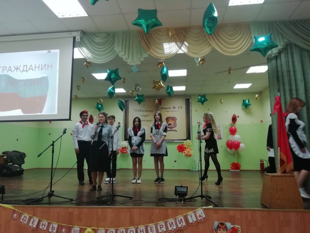 В Красноярском лицее №12 Ленинского района сегодня приняли в пионеры 50 учеников 4-х классов. Алые галстуки — символы пионерии современным школьникам повязали почётные гости и классные руководители. Торжественная церемония приурочена ко Дню пионерии.
