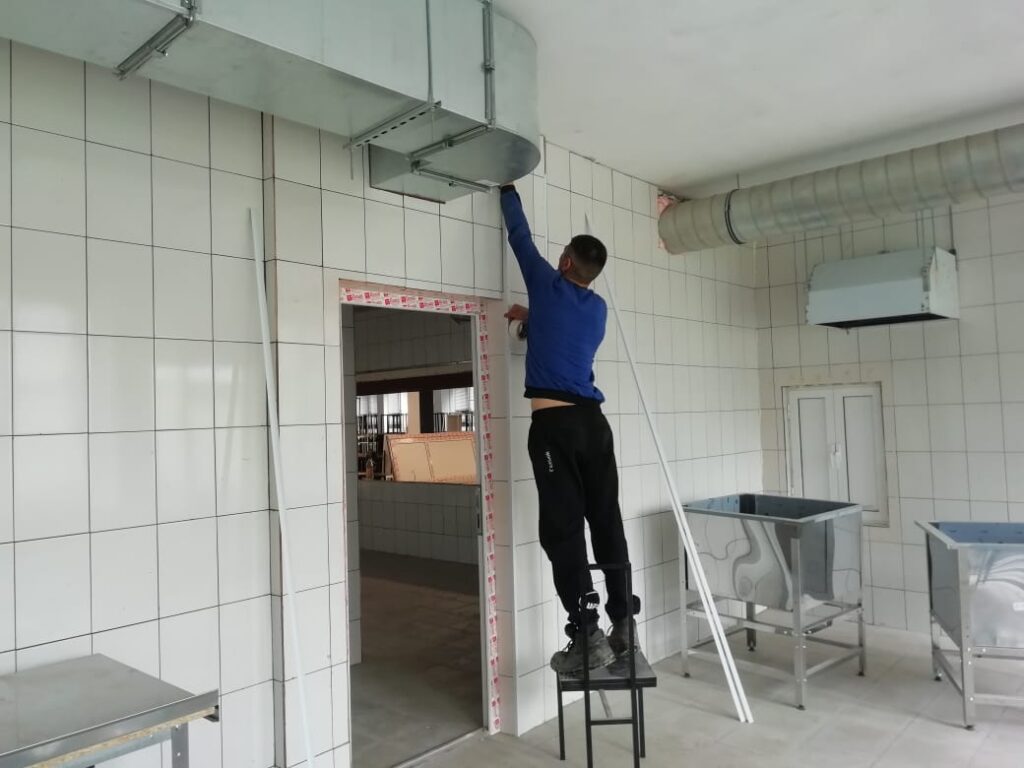Школа №144 построена в 1990 году. Это первый капремонт пищеблока. Рабочие заменили инженерные коммуникации, поменяли перекрытие полов, сняли старую штукатурку и краску со стен и потолков, уложили новый кафель. Вставили новые окна и двери. Сейчас идет монтаж системы вентиляции.